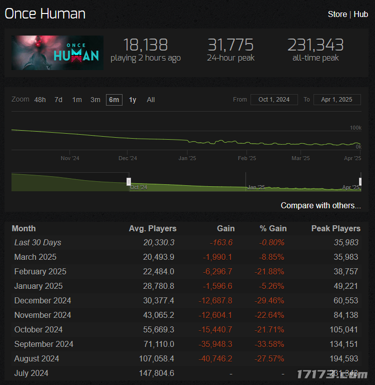 steam日活人数从巅峰的24w,下滑至现在3W左右。
