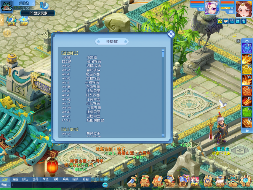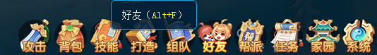 在游戏界面的正下方,有一排重要的功能栏,包括背包、技能、好友等功能都在里面。其实这些功能每个都有对应快捷键的,比如背包是Alt E,组队是Alt T等等。牢记它们的快捷键,会大大提高效率。