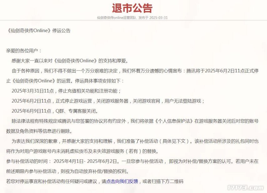 近日由大宇正版授权,腾讯魔方工作室研发运营的《仙剑奇侠传OL》宣布,由于各种原因,官方不得不做出一个万分艰难的决定,游戏将于2025年6月2日停运,未消费的游戏代币可兑换成《火影手游》、《天涯明月刀手游》、《剑侠情缘》对应档次的礼包。近日由大宇正版授权,腾讯魔方工作室研发运营的《仙剑奇侠传OL》宣布,由于各种原因,官方不得不做出一个万分艰难的决定,游戏将于2025年6月2日停运,未消费的游戏代币可兑换成《火影手游》、《天涯明月刀手游》、《剑侠情缘》对应档次的礼包。