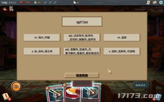 该MOD在游戏中添加了系列遗物道具,每打出一张卡片,都会触发一次单词测验,测验得分将会影响攻击伤害与格挡获得的倍率。