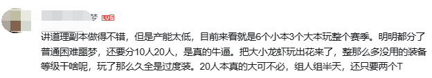 至于赛季制,《诛仙世界》也没有学到赛季制游戏的精髓。副本虽然做的不错,但是产能太低,整个赛季3个月的时间,差不多就是6个小本3个大本,还要被强制分10人和20人,再加上副本难度偏高,对散人以及萌新玩家的体验非常不友好,让不少玩家抱怨连天。